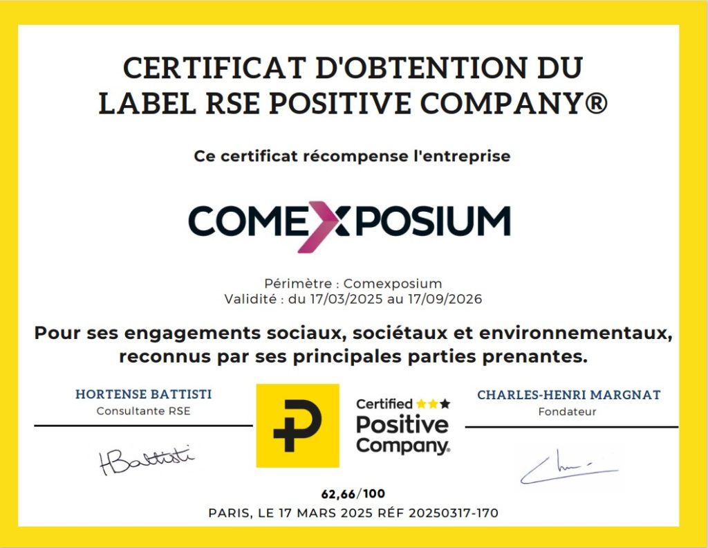 Comexposium, l’un des leaders mondiaux de l’organisation d’événements professionnels et grand public, obtient la labellisation RSE Positive Company®, une reconnaissance de la maturité de sa stratégie RSE et de l’impact de ses engagements sur ses principales parties prenantes. Ce label salue une démarche transparente et équilibrée et confirme la volonté du Groupe de jouer un rôle moteur dans la transformation durable de la filière événementielle.