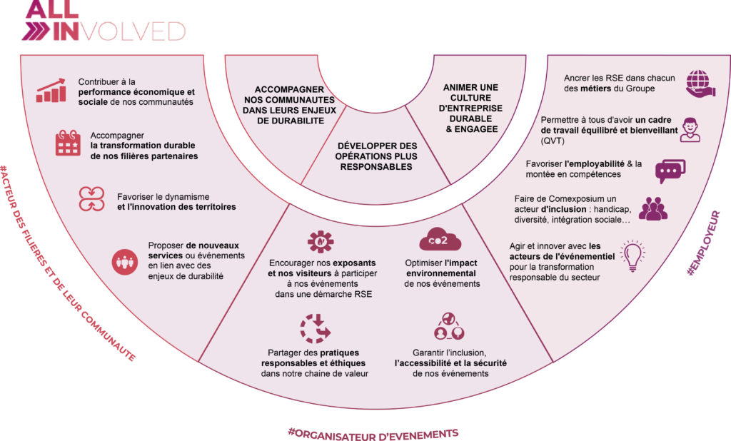 Depuis 2022, Comexposium structure et renforce sa politique de responsabilité sociétale à travers le programme ALL INvolved, pour inscrire durablement ses activités dans une dynamique de transition environnementale, sociale et économique. Cette stratégie repose sur une conviction : les défis environnementaux et sociaux du secteur événementiel nécessitent une mobilisation collective – équipes, partenaires, fournisseurs, exposants – autour d’une même exigence de transformation.